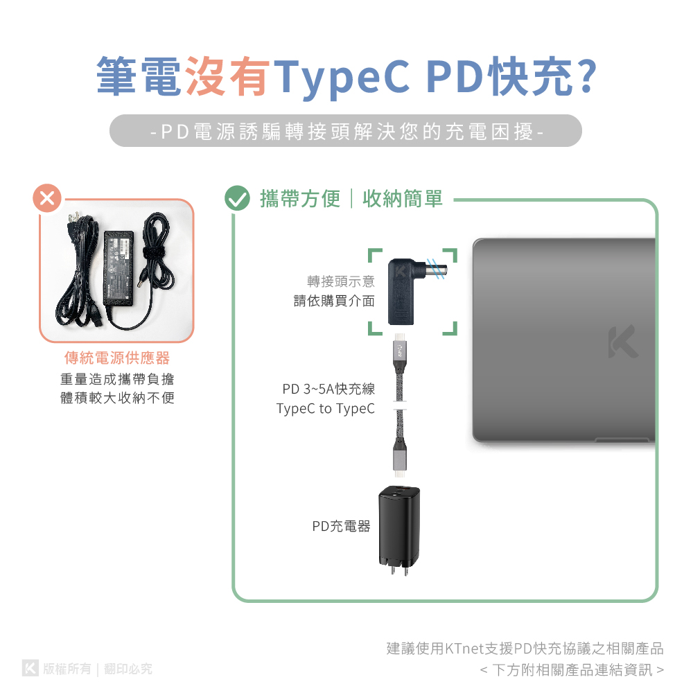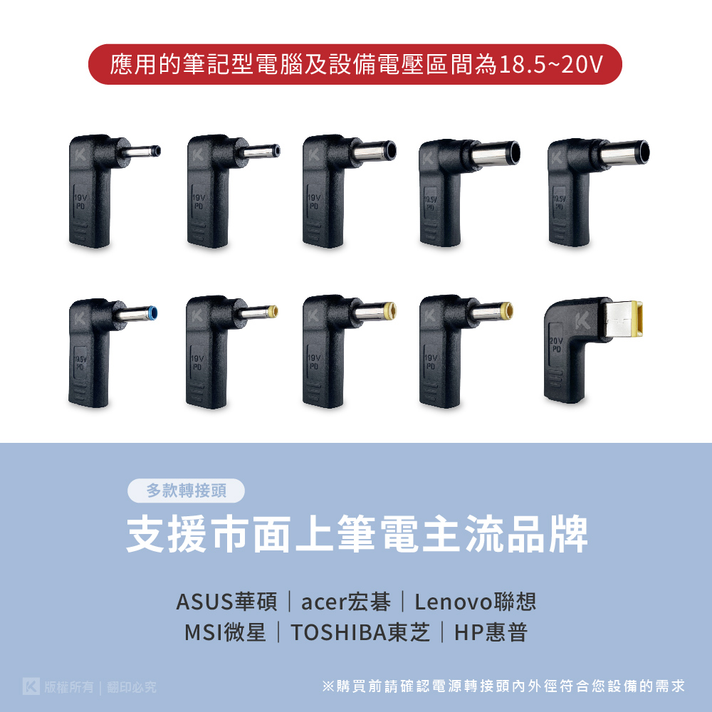 【特色】 1.Typec母轉DC公的電源轉接DC頭 2.支援PD快充協議,內置誘導晶片,過5A電流,最高供應100W輸出 3.搭配PD及Typec口充電器使用,便於針對筆記型電腦.手機.平板.遊戲機.印表機.掃描器.螢幕各項設備供電 4.搭配PD電源頭可為Acer.Asus.HP.聯想Lenovo.Dell.東芝.MSI等供電 產品尺寸 : 32x10x36mm 產品重量 : 12.5g±5g 材 質 : PVC塑料 包裝尺寸 : 82x30x135mm 包裝內容 : 轉接頭x1 【PD 5A快充線連結】 https://b2b.ktnet.com.tw/Product.aspx?PID=KTYTCFF06E-1.2M&CID=34,40,029,052,02 注意事項 1.購買前請確認電源轉接DC頭內外徑尺寸符合您的需求 2.充電頭供電不足會造成時充時不充或斷充狀態 3.TYPEC-TYPEC線請選購5A+全智能晶片線材