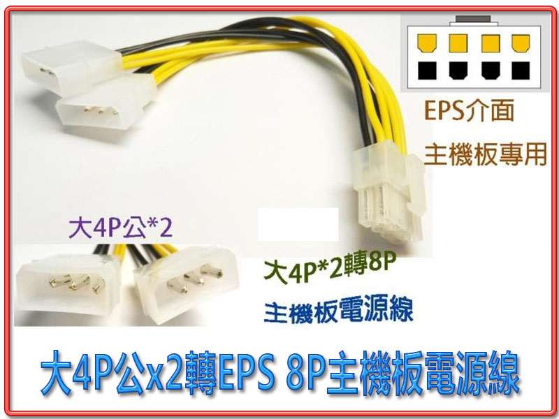 ‧介面:大4P公x2轉EPS 8P ‧純銅線製造,將電源的衰減降到最少 ‧提供穩定的電源,電源轉換專用線 ‧把電源供應器上的2個大4P電源,轉成EPS 8P主機板電源
