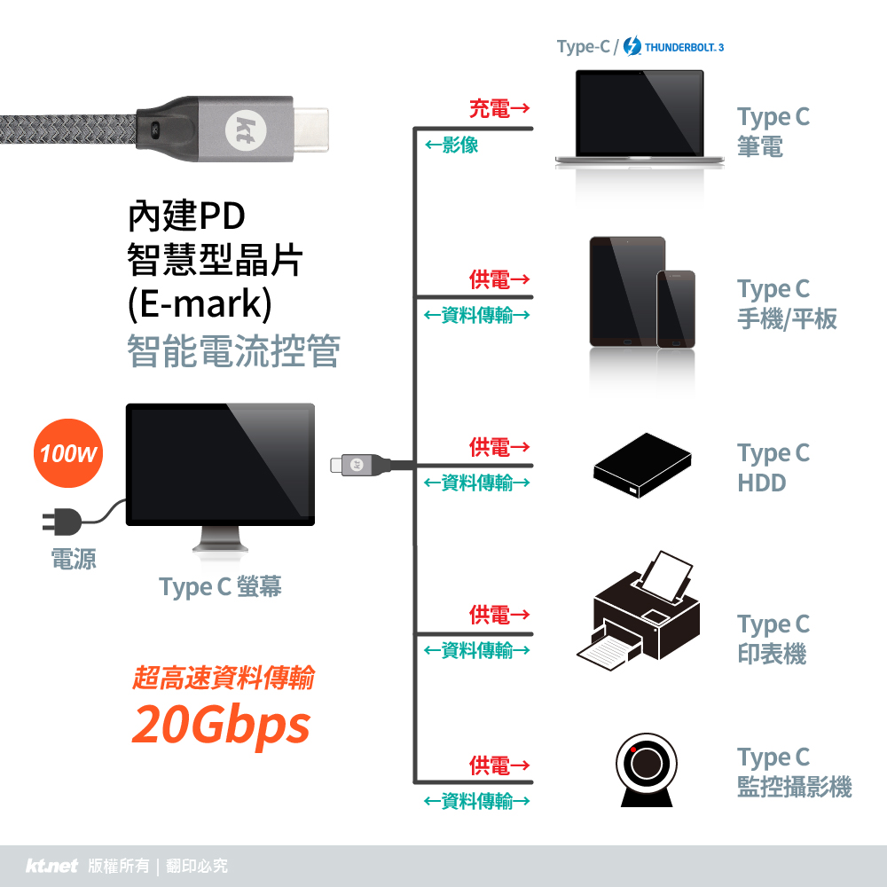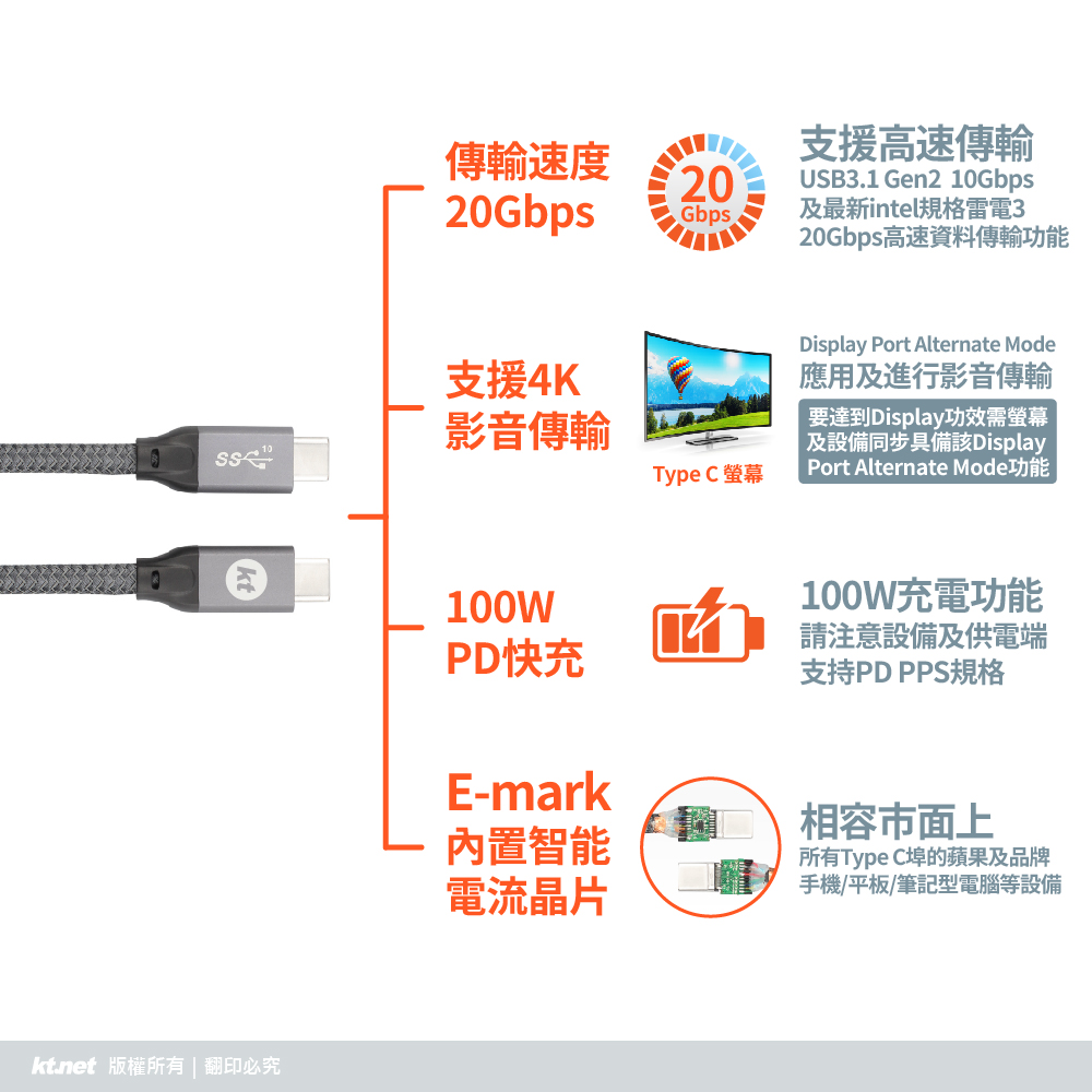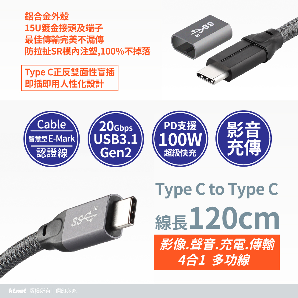 【專業PD用線】G76E USB3.1 Gen2 eMark晶片 C-C 影訊+音訊+充電+傳輸四合一  100W/5A 雷電3