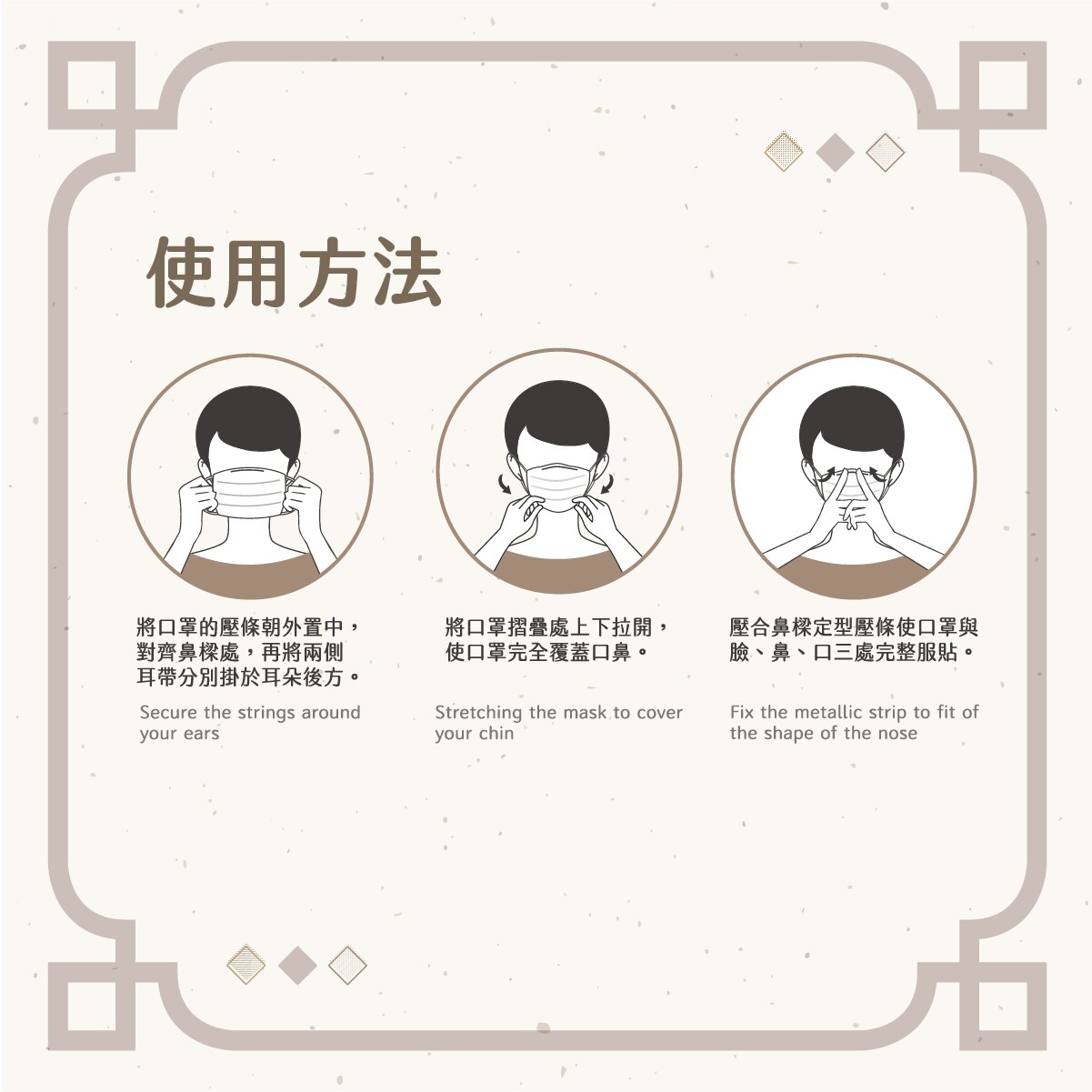 使用方式 :1.將口罩壓條朝外置中,對齊鼻樑處,將兩側耳帶掛於耳後。