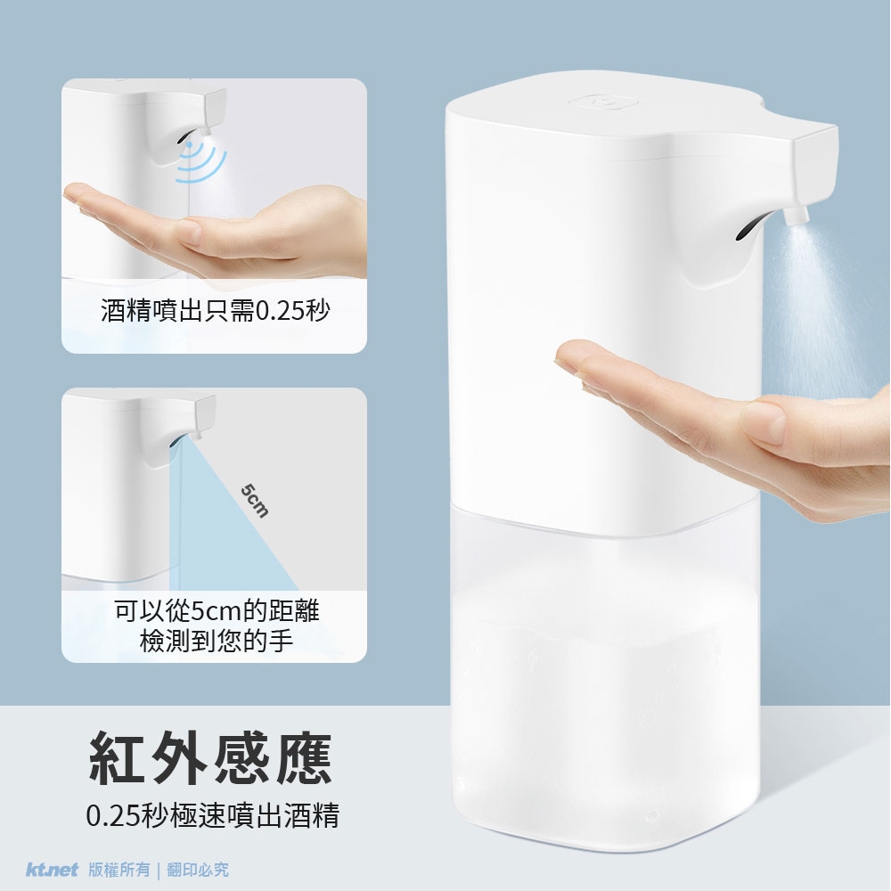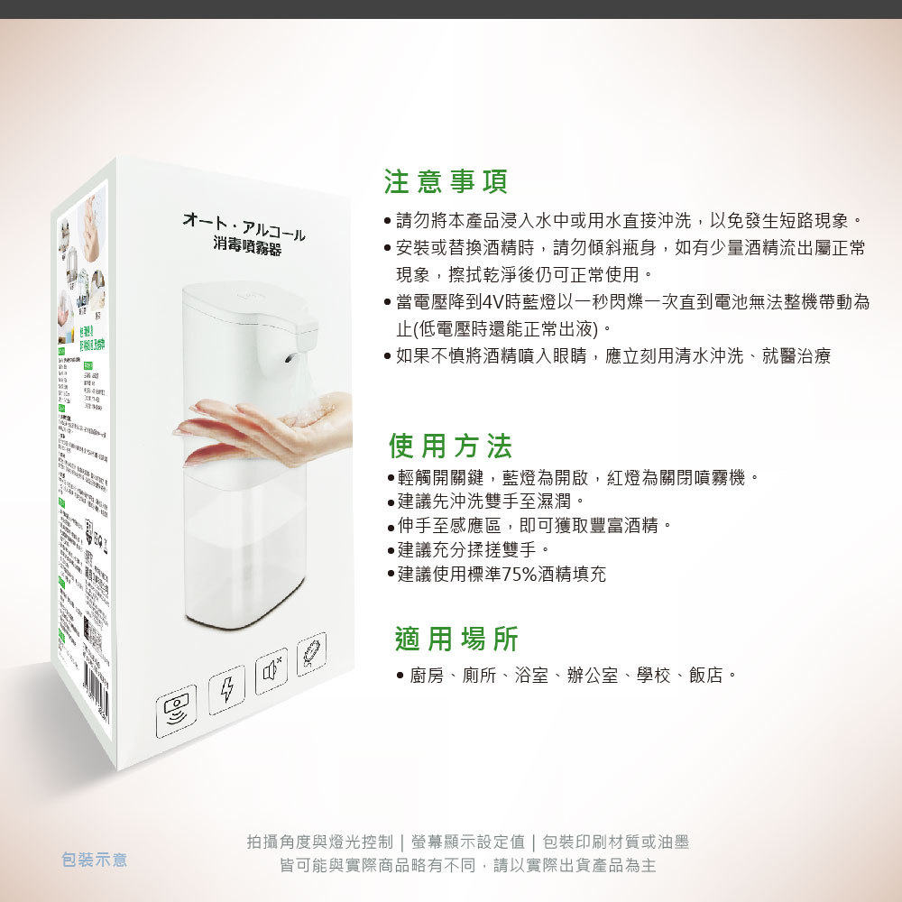 ◆規格: (1) 產品名稱: 全自動感應式酒精消毒噴霧機350ml (2) 產品顏色: 瓷白 (3) 產品淨重: 204G (4) 產品毛重: 283g (5) 容量: 350ML (6) 產品尺寸: 19*7.3*10CM (7) 彩盒包裝: 21*11*8 CM 基本參數: 主要材質: ABS 額定電壓: 6V 電池類型: 4顆 3號鹼性電池 工作溫度: 5℃~40℃ 工作濕度: 0%—85%RH ◆特色: 1、自動感應式出酒精: 紅外線感應技術,快速感應時間僅為0.25s, 手在感應區域(距離為0-5cm)時,自動噴出綿密的酒精,清潔雙手。 2、節能環保: 創新的氣泡泵技術,將酒精轉化為噴氣液體,減少50%的使用量微型 高效能馬達,低功耗,更安靜。 3、簡潔設計: 經典設計簡潔風格,精緻/時尚的實用個人商品,養成自我清潔習慣,提高自我抗菌能力 噴霧機瓶身選用高感光磨砂材質,清透乾淨更能隨時檢視水位 ◆使用方法: 1、輕觸開關鍵,藍燈為開啟,紅燈為關閉噴霧機 2、建議先沖洗雙手至濕潤。 3、伸手至感應區,即可獲取豐富酒精。 4、建議充分揉搓雙手。 5、建議使用標準75%酒精填充 ◆注意事項: 1、請勿將本產品浸入水中或用水直接沖洗,以免發生短路現象。 2、安裝或替換酒精時,請勿傾斜瓶身。如有少量酒精流出屬正常現象,擦拭乾淨後仍可正常使用。 3、當電壓降到4V時藍燈以一秒閃爍一次 直到電池無法整機帶動為止(低電壓時還能正常出液) ◆保固時間:3個月